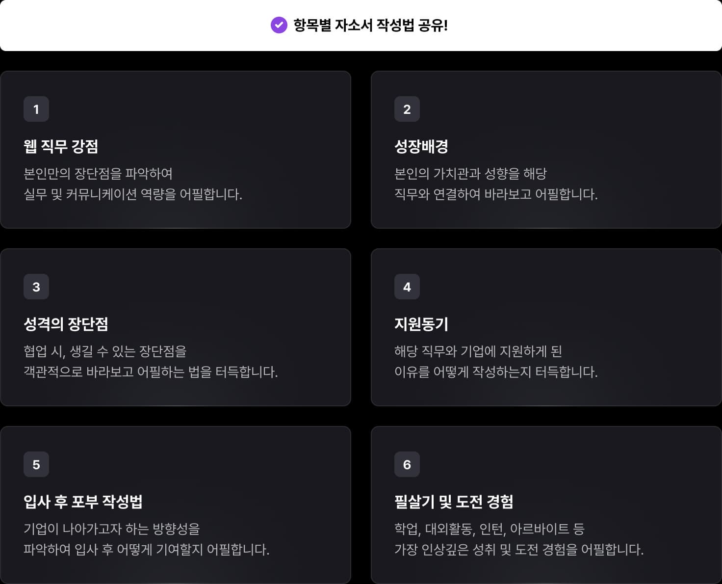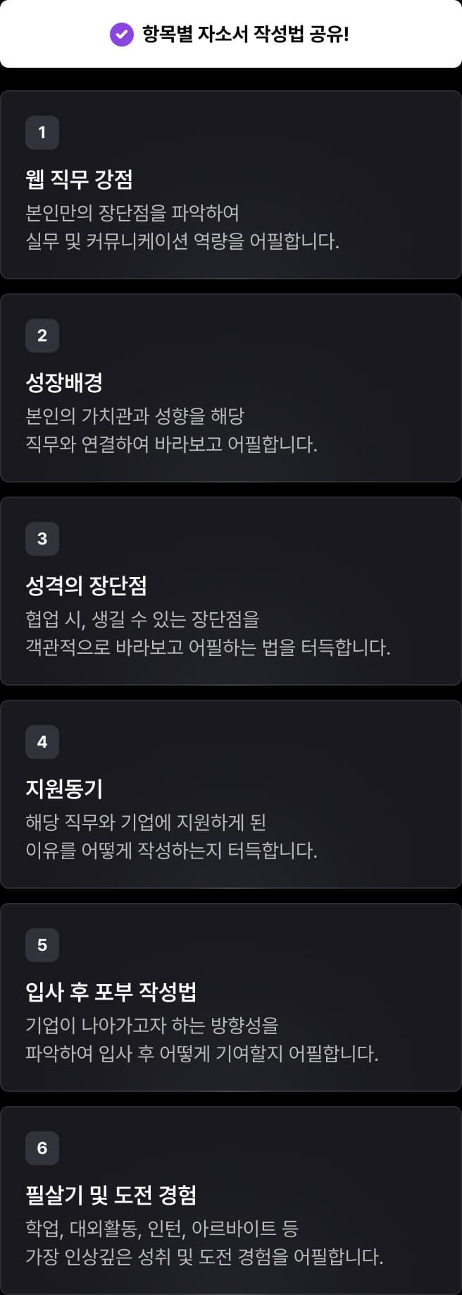 자소서 항목별 분석은 질문에 대한 이해와 접근 방법을 알려드리는 파트입니다.